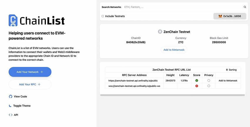 你可以通过 ChainList 轻松地将 ZenChain 与 MetaMask 集成。ChainList 是一个值得信赖的聚合器,提供经过验证的网络详细信息和安全的 RPC 端点。