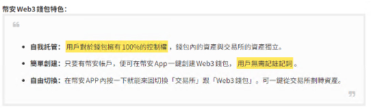 币安Web3钱包是币安交易所的专属钱包,设计初衷就是让用户能简单安全地使用加密资产。几秒钟就能创建好Web3钱包,还能用加密资产赚取奖励,进行跨链交易。