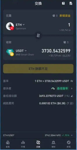 例如:下图页面显示,我想将钱包中Optimism链上的ETH,兑换成BNB Smart Chain链的USDT,系统会自动帮我匹配可支持的跨链协议并得出最佳汇率,并显示手续费等相关信息。