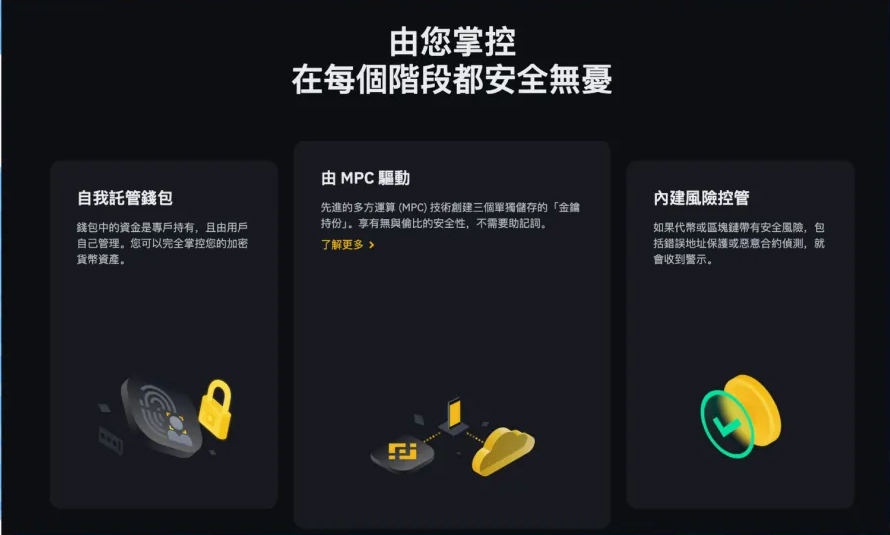 币安Web3钱包是币安App内置的一款自托管加密货币钱包。它的最大特点是让你对自己的资产拥有完全控制权,不受任何第三方组织控制,属于去中心化钱包的一种。钱包采用了多方计算(MPC)技术来保护私钥,将私钥分成三部分分别存放在不同地方,让你不再需要手写记录一长串助记词,就能安全使用自托管钱包。