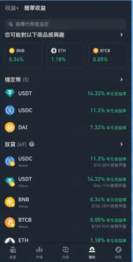 理财页面整合了多个DeFi协议,让你的闲置资产发挥作用,创造更多收益。你可以透过质押、借贷或页面中其他DeFi工具来增加你的资产价值。无论是质押你的加密货币以获得利息,还是参与借贷市场赚取收益,币安Web3钱包都提供了简单易用的界面,让你轻松操作。