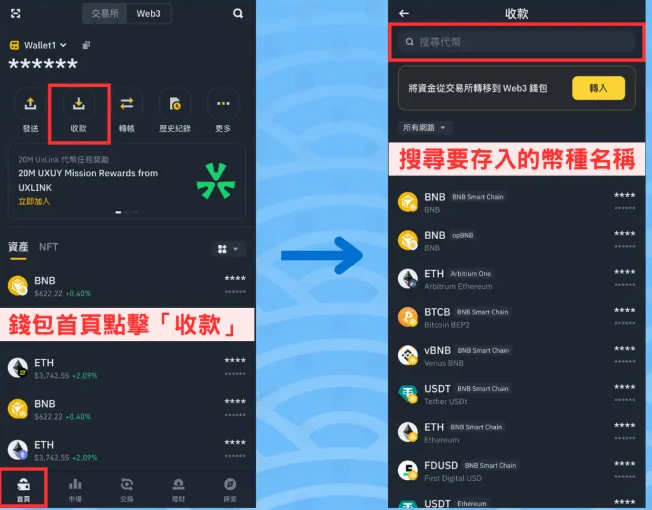 要将加密货币存进币安Web3钱包,首先进入钱包"首页",点击"收款",接着搜寻你要存入的币种名称,取得存币地址。记得要选到对的"币种"跟"主链/网络"。