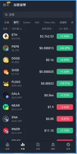 市场页面汇总了链上加密货币的市场状况,让你可以看到不同币种或者相同币种在不同链上的交易信息,包括当前价格、交易量、涨跌幅、市值和历史走势等。你可以点进去每个币种,查看详细信息,还有快捷功能,方便你针对该链的该币种进行发送、收款和跨链兑币操作。