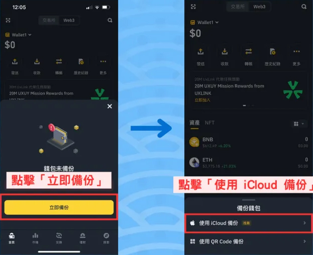最后就是要将私钥备份到你的iCloud帐户(Android用户可备份到Google云端),只要在画面上点击"备份",等待程序完成后,就完成备份,可以开始使用币安Web3钱包了。