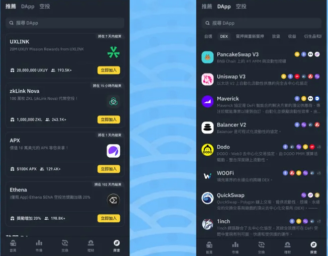 探索页面带你进入Web3世界的各种应用和服务。你可以发现和连接到各种DApp,包括去中心化金融(DeFi)、游戏、社交网络、空投项目和更多其他应用。这让你能够发现新的机会,并充分利用币安Web3钱包的多功能性,拓展你的加密货币使用场景,而且无须跳转到其他平台,就能在钱包中跟各项知名的DApp交互。