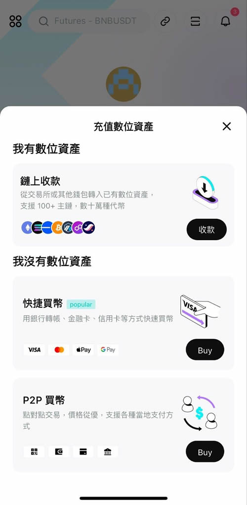 2、选择充值方式,目前有链上收款、快捷买币(信用卡、手机支付)以及 P2P 买币
