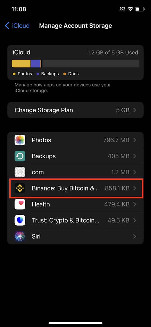 iOS设备:您可以在【设置】中找到密钥分片。进入iCloud账户,然后点击【管理储存空间】。您的数据存储在【币安】下。