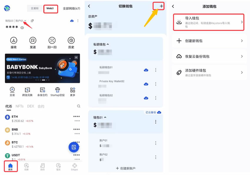 进入Gate.io App Web3首页,点击钱包名称进入钱包页面,点击右上角添加➕符号即可导入钱包。您可以选择助记词或私钥进行导入。
