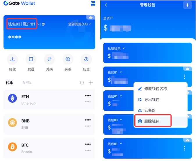 点击钱包名称进入“管理钱包”页面,每个钱包右侧都可以点击选择“删除钱包”,输入资金密码后即可从本设备上将此钱包移除。之后,您还可以通过助记词或私钥重新导入。