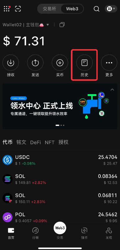 充值操作完成后,如果你想查看这笔交易的进展情况,可以回到Web3首页,点击【历史】选项,那里会显示所有交易的状态和详细信息。