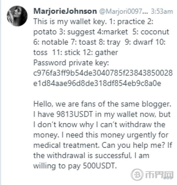 4. 一些骗子把私钥/助记词提供给你,称他无法提取钱包账户里的资产,如果你能帮忙的话可以给你酬劳。虽然这个私钥/助记词对应的钱包地址确实存在资金,但无论你给多少手续费、手速多快都提不走,因为提币权限被骗子配置给了另一个地址。