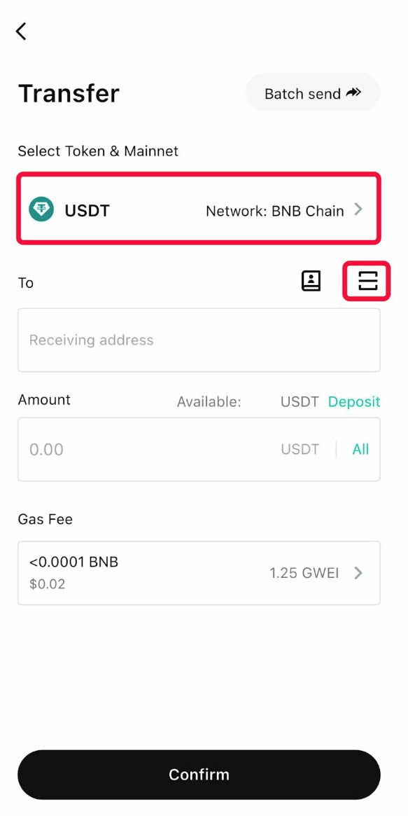 第3步:再次确认币种/代币和网络/区块链。复制上一步生成的Bitget充值地址并粘贴到这里,或者点击图标扫描二维码。输入想要存入Bitget账户的资产金额,然后点击"确认"。