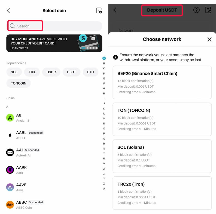 选择你要充值的网络/区块链和币种/代币。因为我们以USDT的Bitget充值地址(BEP20/BNB Chain格式)为例,所以需要在Bitget Wallet中找到BNB Chain和USDT。转账前一定要仔细核对网络是否正确。