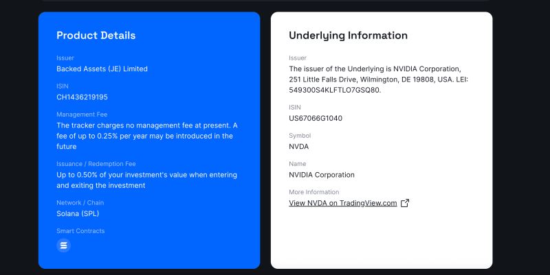 - 受监管发行人收购资产:该流程始于一家受监管的专业金融机构。Backed Finance 就是此类发行人的典型代表,该公司持有瑞士或欧盟监管牌照。该发行人使用主经纪商渠道(例如盈透证券 (IBKR))在美国股票市场购买真实股票(例如NVDA )。