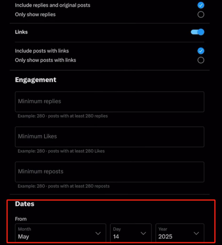 再次使用X的高级搜索功能。你可以在"全部搜索词"搜索框中输入"看涨比特币"、"比特币低点"、"看涨$BTC"或"$BTC底部"之类的短语。然后在底部附近输入你感兴趣的日期范围,即4月5日至12日。