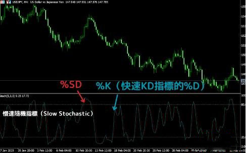 | 慢速随机指标(Slow Stochastic) | %K(实为快速 %D)、%SD 线 | 对市场反应较平稳,较少假信号 |
