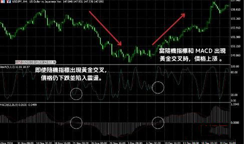 在图表中,当随机指标出现黄金交叉(买入信号)时,如果只依靠随机指标进行交易,可能会因为价格下跌而止损。