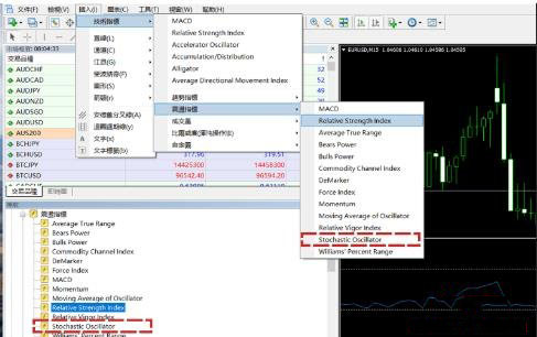 ③点击菜单栏的"插入"-"指标"-"震荡"-"Stochastic Oscillator";或者点击导航栏的"指标"-"震荡"-"Stochastic Oscillator"。