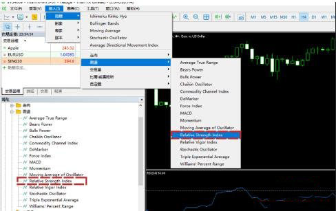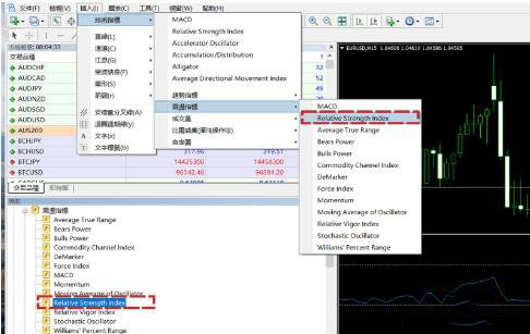 ③ 点击菜单栏的"插入"-"指标"-"震荡"-"Relative Strength Index";或者点击导航栏的"指标"-"震荡"-"Relative Strength Index"。