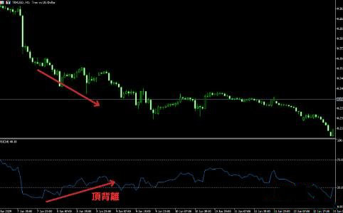 当价格创新高,但RSI无法同步创新高,这叫作顶背离,暗示上涨趋势可能减弱,市场有机会反转下跌。