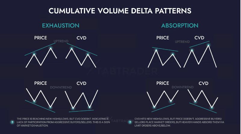 - CVD下降:红色向下倾斜表示净卖压。如果价格下跌且CVD也下降,则确认市场疲软。
