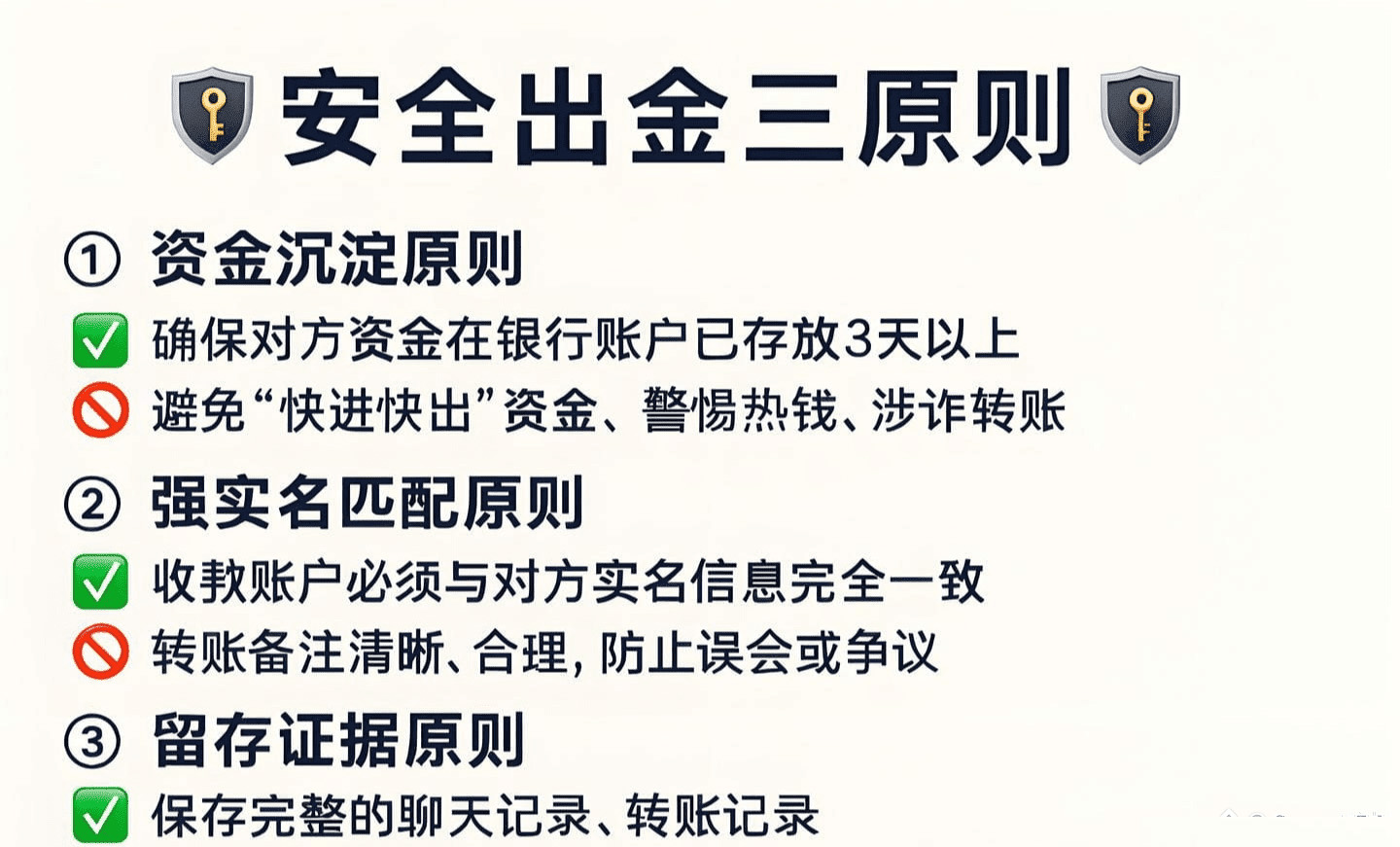 答:出金的底线思维包括:备份所有交易记录、转账明细和聊天截图至少5年;定期清理手机中与虚拟货币相关的敏感内容;预留生活资金,不要孤注一掷;分散账户,避免全仓被冻结;学会从监管角度评估资金来源是否合规。