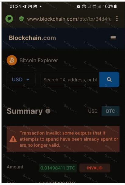 Daniel试图在付款前等待至少两次确认,但确认从未到达。于是他决定将自己的地址粘贴到区块链浏览器上,并发现交易因双花企图而判定无效。