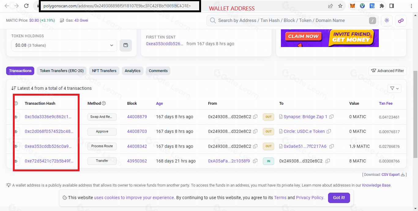 以下是如何使用Polygonscan检查钱包地址的交易详细信息的示例: