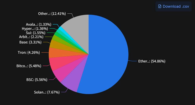 TVL = Total Value Lock,锁定在该链上的加密资产总额,能呈现正在该链上参与协议的资产规模,是评估DeFi生态的直接指标之一。