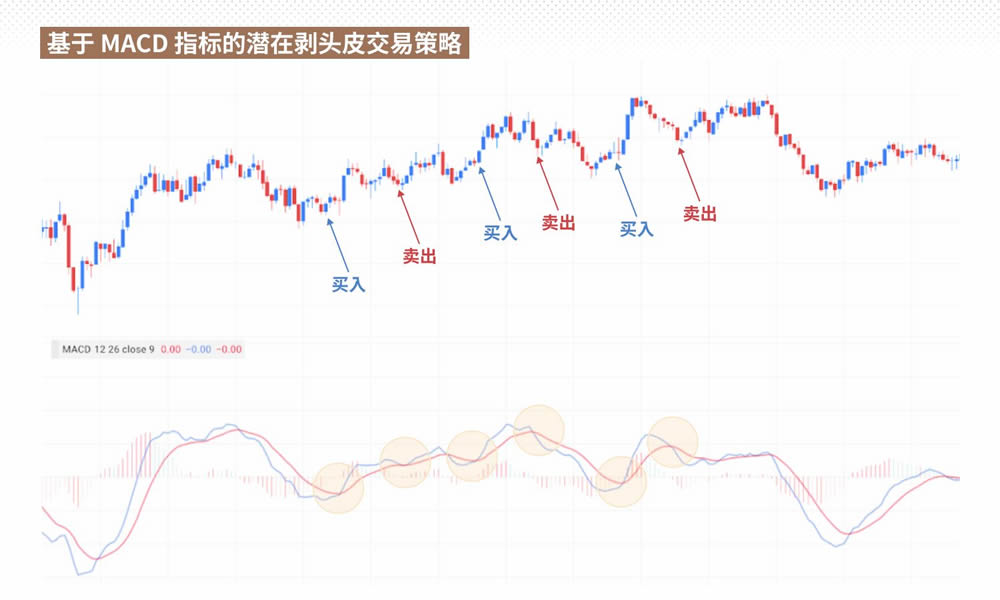 上图展示了在极短时间框架内使用MACD指标的剥头皮策略实例。当MACD(蓝线)向上穿过信号线(红线)时,可能是买入信号;当它向下穿过信号线时,则可能是卖出信号。每笔剥头皮交易仅持续数秒。此图表仅供演示,过往业绩不能保证未来结果。