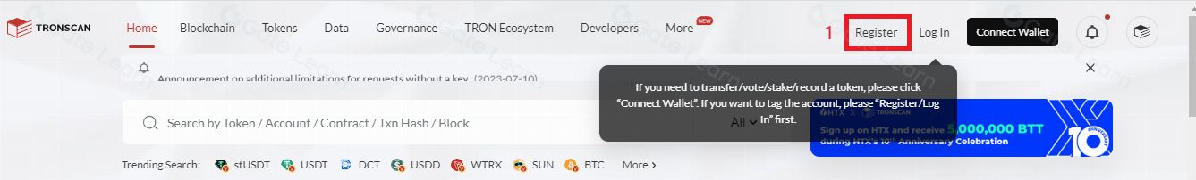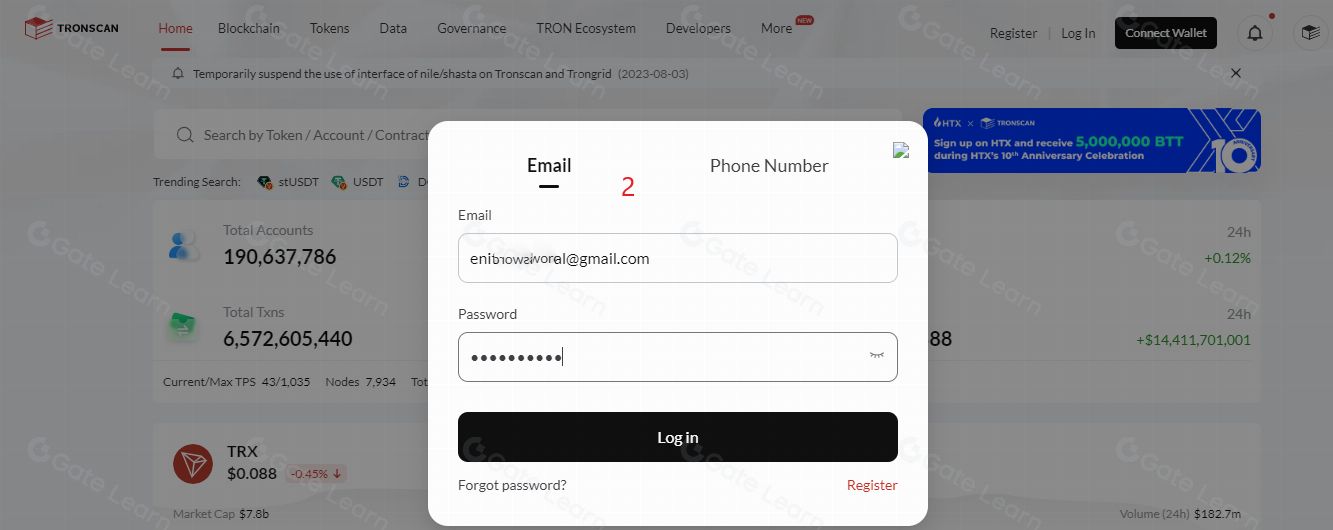 创建TronScan帐户很简单。首先,请访问网站tronscan.org。在主页上,使用有效的电子邮件地址和密码注册来创建帐户。您还可选择使用您的电话号码创建帐户。或者,您可通过连接到Tronlink或Ledger钱包等去中心化钱包来创建账户。