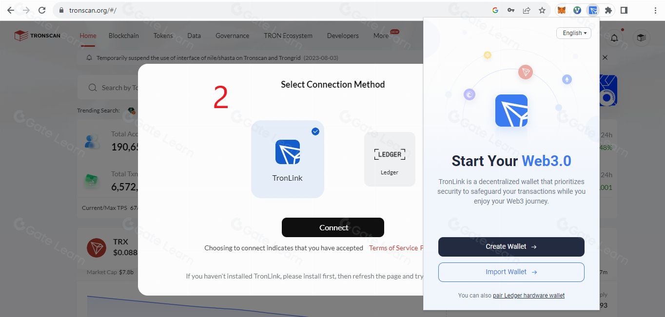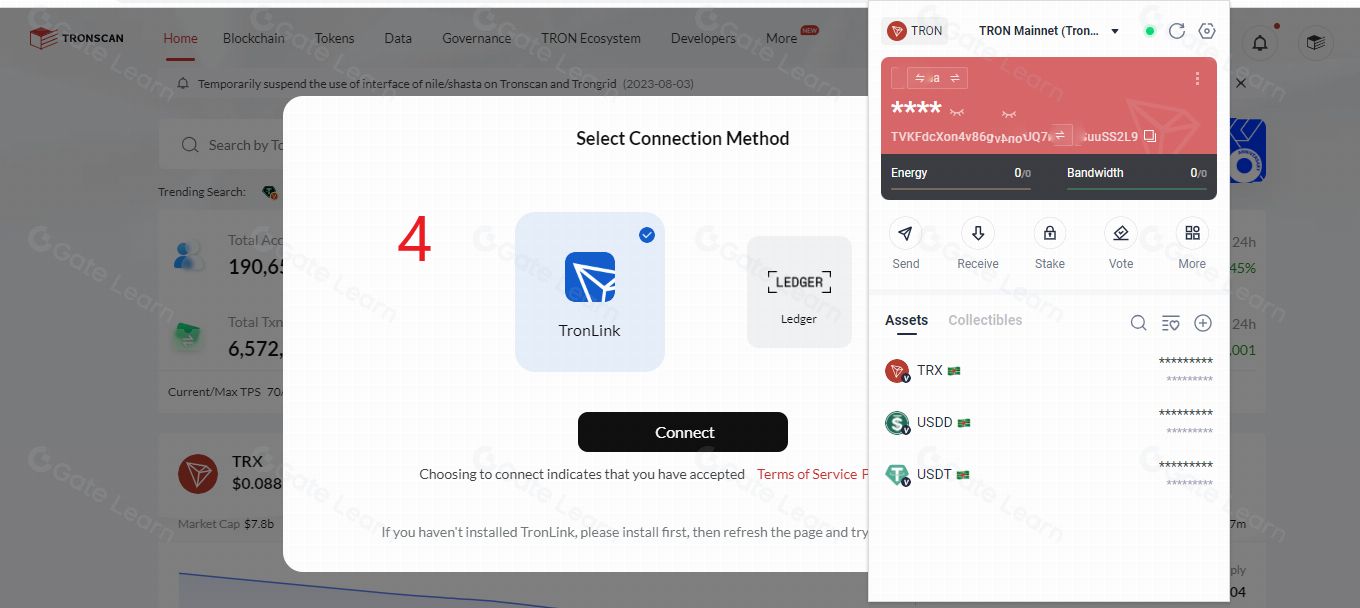 - 创建钱包后,单击"连接"将钱包连接到TronScan。如果您遇到问题,只需重新加载页面并再次连接即可。现在您已成功创建Tronlink钱包,可以查看您持有的代币及其数量和价值。