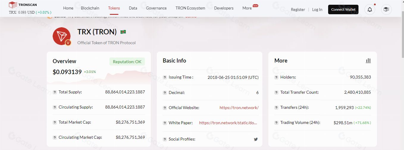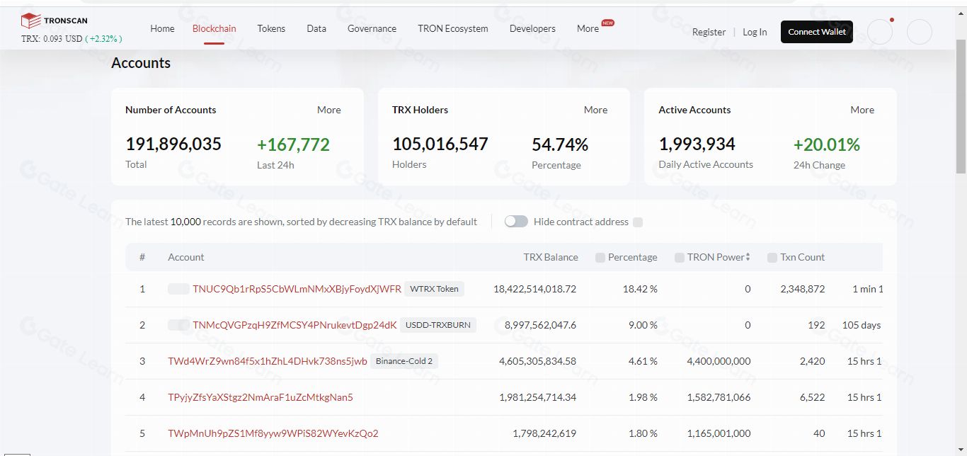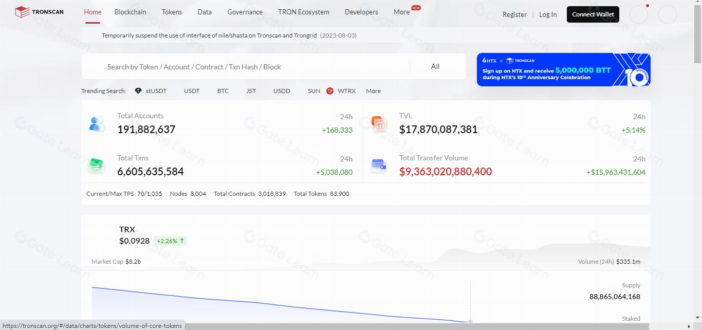 通过主页,您可以了解Tronscan的总体信息。这里展示了TRX的价格和市值、TRON上的激活账户总数、锁定在TRON协议中所有的资产的TVL(总价值锁定)价值、TRON上记录的总交易笔数、TRON上热门代币的总转账金额等,让您一目了然,实时查看所有数据。
