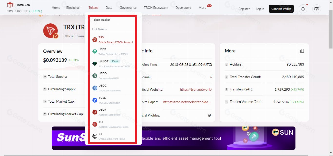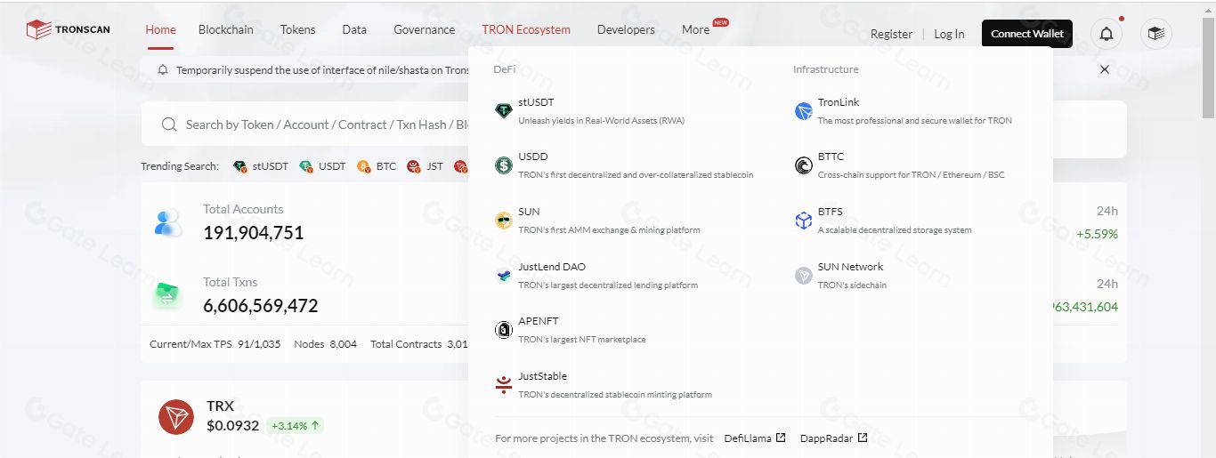 在Tron生态系统板块,您可探索DeFi(如stUSDT、SUN、APENFT)和基础设施(如TronLink、BTTC和BTFS)。