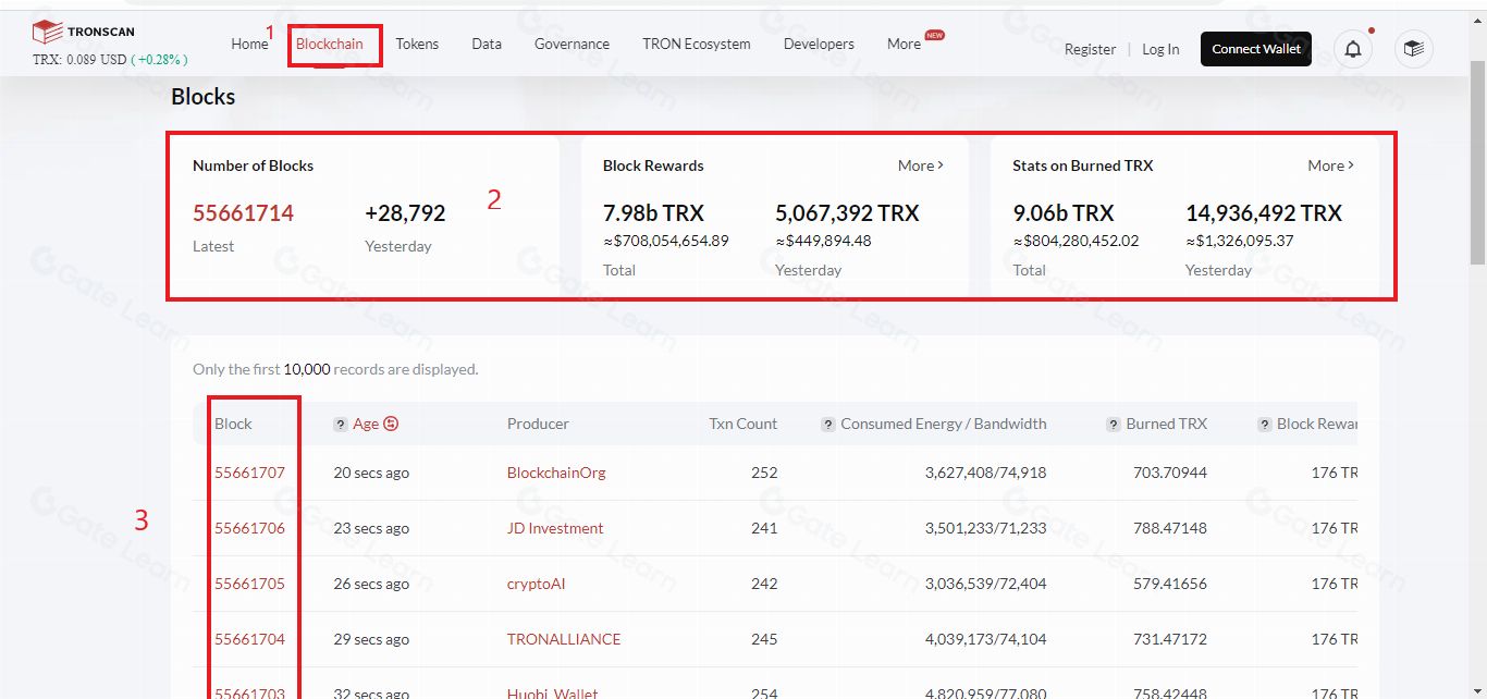 - 要访问TRON区块链区块,您需单击"区块链"并选择"区块"。