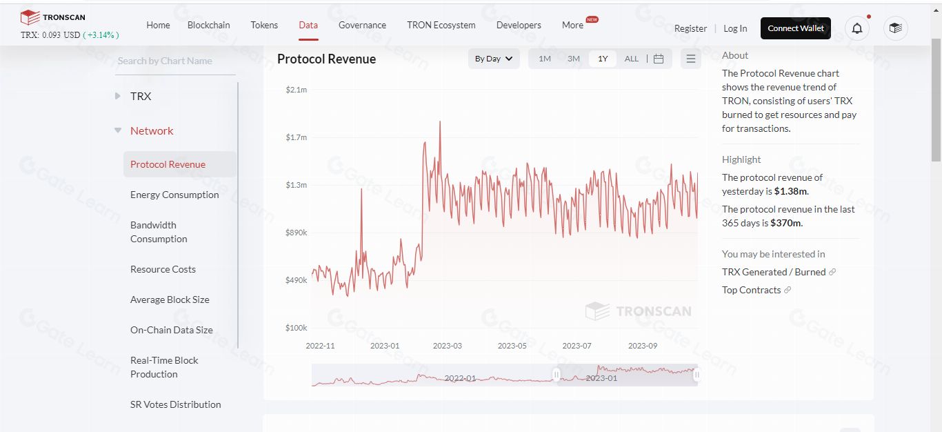 来源:tronscan.org例如,在"图表"下,如果您点击"协议收入",那么就能访问其详细信息并查看TRON的收入趋势图表,该图表展示了TRX用户为获取资源和支付交易而销毁的价值。