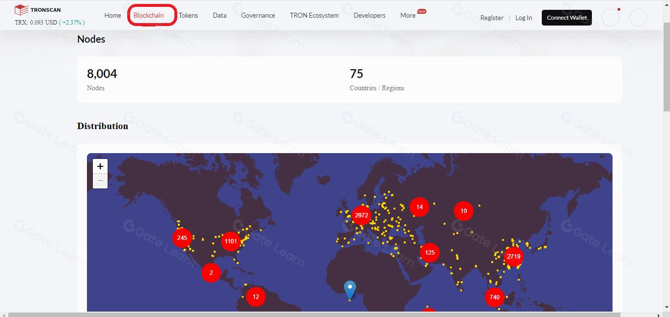 您可查看节点总数以及节点可用的国家和地区,包括每个地区节点总数图形概览地图。该地图甚至能识别您是从何处访问TRON区块链的。