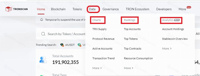 在数据板块,您可查看图表、排名和分析,以帮助您进一步了解TRON区块链。
