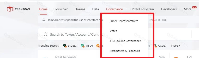您可在治理板块查看超级代表并投票、参与TRX质押治理等等。您甚至还能申请成为超级代表。