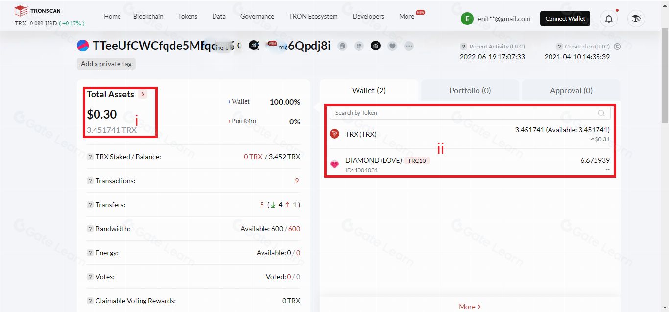 - 如图(i.)所示,展示了钱包持有的TRX总资产,图(ii.)显示了钱包地址中的代币(TRX & LOVE)和余额。
