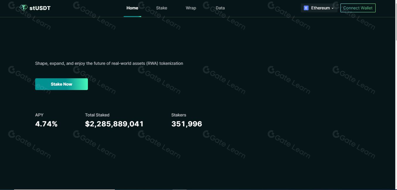 来源:tronscan.org例如,在"DeFi"下,如果您点击"stUSDT",那么您将来到到Stusdt.io网站,让您能直接与代币交互并执行诸如质押真实世界资产(RWA)等操作。