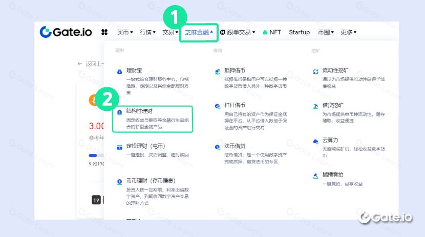 一、登录 Gate.io 个人账户,点击导航栏【芝麻金融】→【结构性理财】,进入结构性理财页面。