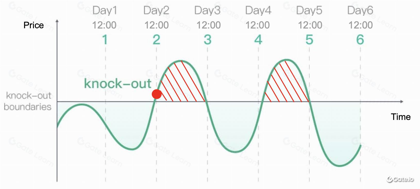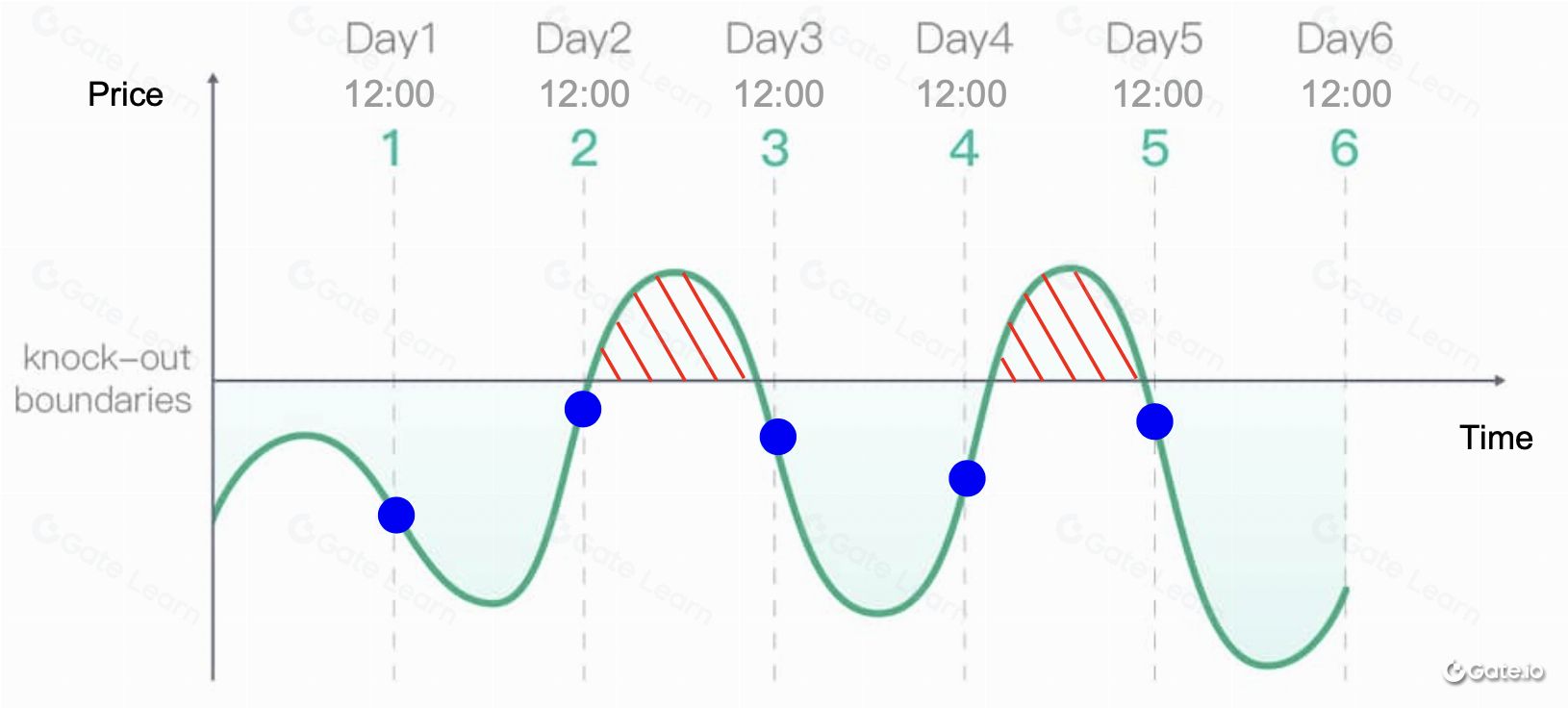 为了增加用户获取高收益的机会,Gate.io 采用了非连续的取样价格观测机制,即使观察期间内标的资产价格曾经超过敲出价格,只要观察时并未超过敲出价格,用户仍旧有机会获取超额收益。如下图范例所示,采用取样价格观测机制时,即使部分时段标的资产曾经超过敲出价格界线,仍旧视为未超过敲出价格。