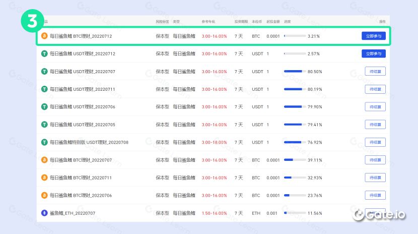 Gate.io 平台的鲨鱼鳍理财产品支持灵活的计息结算,可以满足大多数投资者的需求,在 Gate.io 平台参与鲨鱼鳍理财十分简单,仅需以下四个步骤: