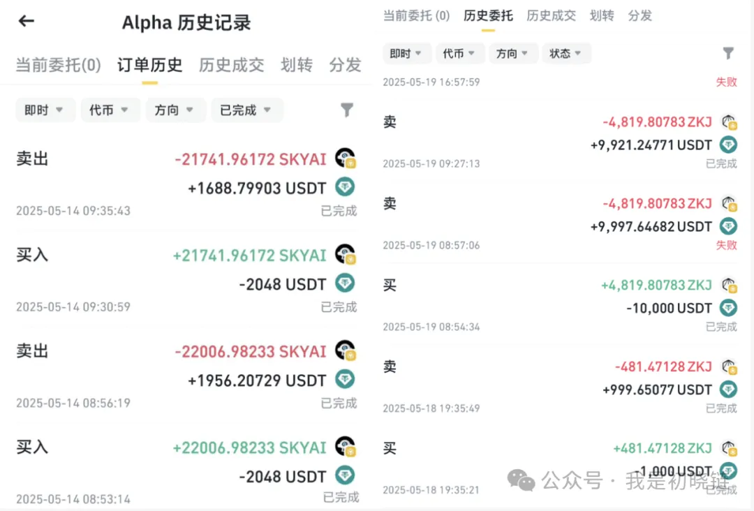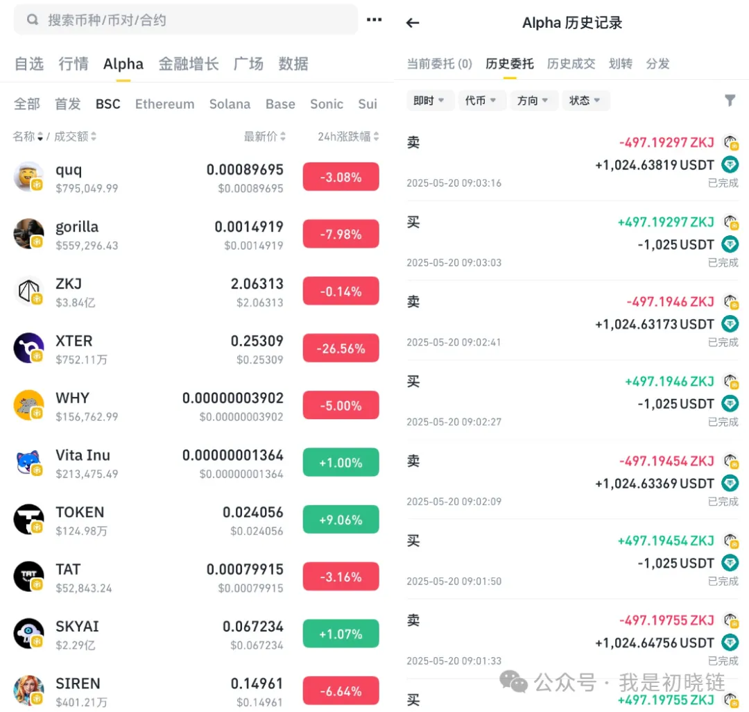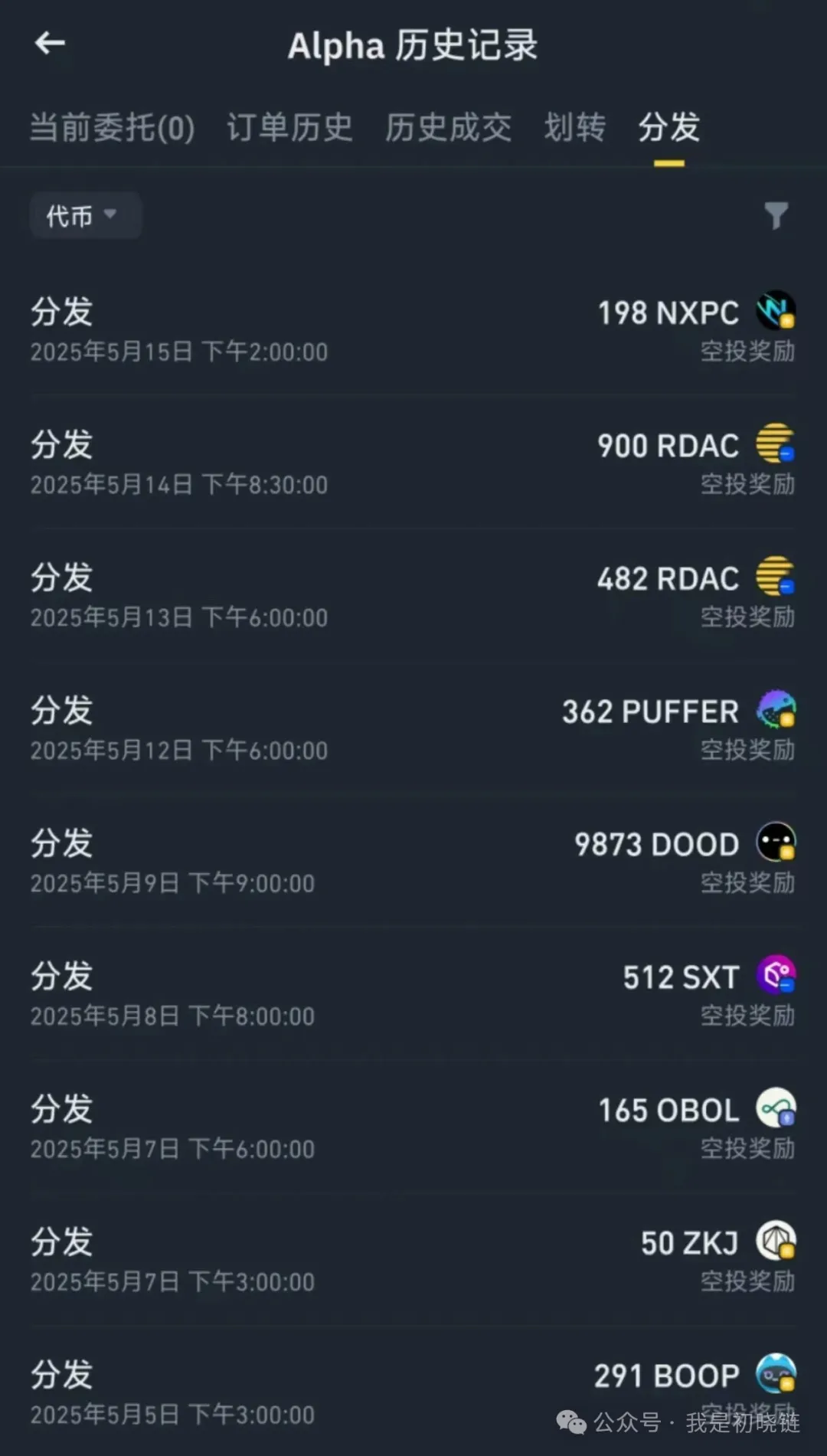 用户只需要交易Alpha生态代币(即买入),就能获得对应的Alpha积分。根据买入的Alpha代币金额来计算积分,达到积分门槛后就可以获得Alpha空投。空投的代币可以随时卖出,每次空投的价值从几十到几百美元不等。例如,5月15日空投的198个NXPC,单次空投收益就达到了600美元。