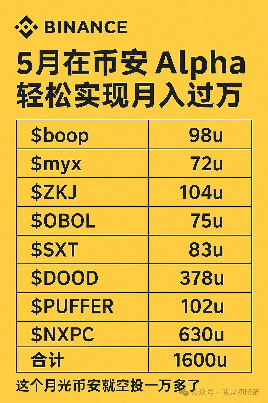 币安Alpha空投是一种确定性较高、门槛较低、见效较快的空投玩法。只要达到Alpha积分要求,就能获得Alpha空投奖励。有人统计了5月份的Alpha空投收益,每期都满足Alpha积分要求的情况下,累计空投收益达到了1600美元。这其中时间成本仅为15天,资金成本大约40美元左右,性价比相当不错。