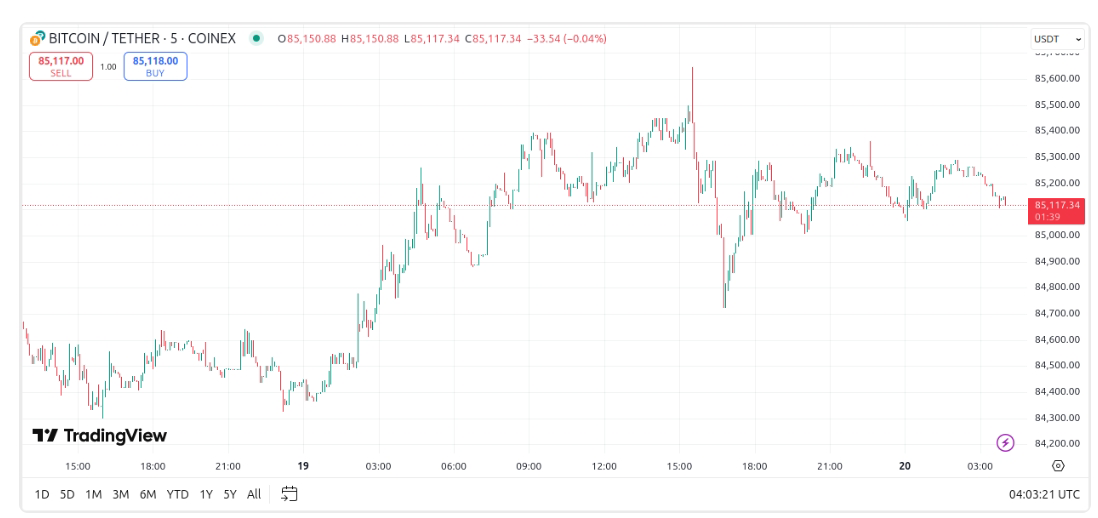 在这24小时期间,BTC呈现出横盘整理的态势,在85,600美元的高点和84,200美元的低点之间小幅波动。这是典型的区间市场——非常适合网格交易策略。
