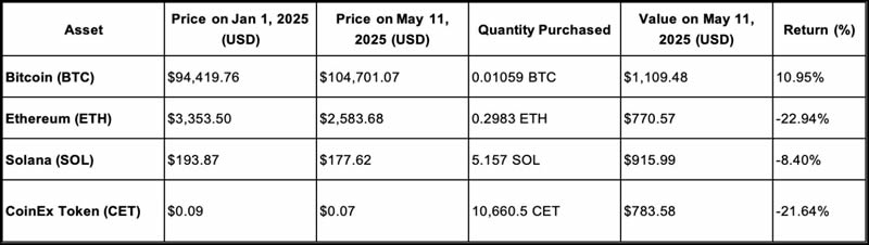 为了说明加密货币表现回顾的实际应用,让我们分析一个由四种知名加密货币组成的假设投资组合:截至2025年5月11日的比特币(BTC)、以太坊(ETH)、索拉纳(SOL)和CoinEx Token(CET)。