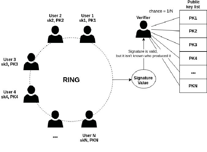 签名者会选择一组公钥(包含自己的公钥)构成一个"环",并通过数学函数将自己的私钥与其他成员的公钥进行混合。