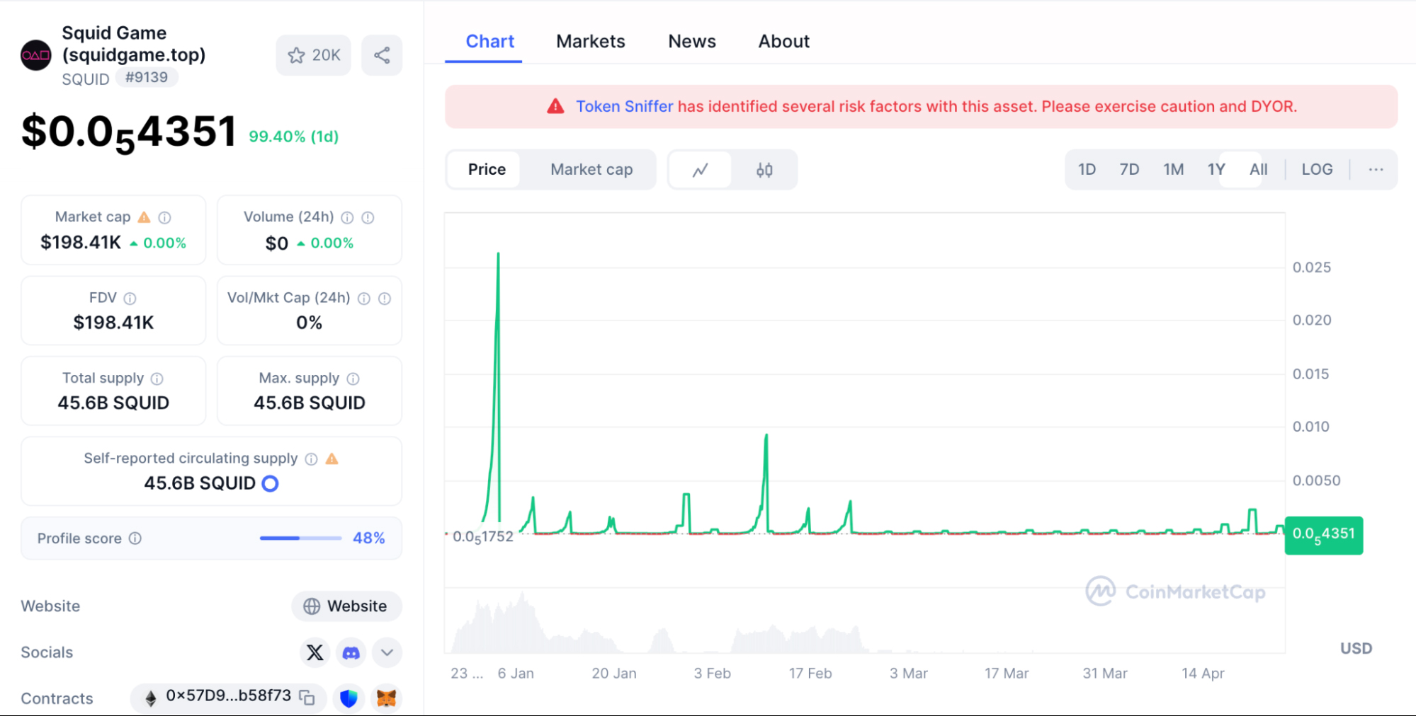该代币发行初期涨幅惊人,短时间内上涨上千倍。但很快用户发现,这个代币根本无法卖出,流动性受到严格限制。几天后,开发者清空了流动性池,卷走数百万美元后彻底失联,SQUID一天内暴跌99.99%,成为了Web3历史上典型的"Rug Pull"(拔地毯:指开发者清空资金池后跑路)事件。